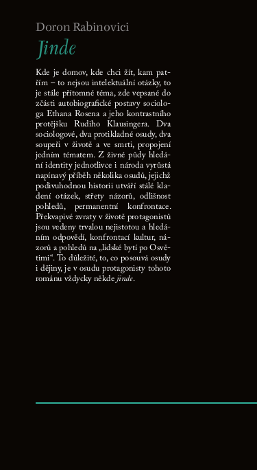Tahle báječná kniha je napínavá jako detektivka, komická jako nejlepší filmy Woodyho Allena a člověka přitom zasáhne svým smutkem. V románu Jinde zaměřil Doron Rabinovici svůj kritický pohled na absurditu mýtu o původu, na chiméru etnika a leckdy pošetilé hledání identity a vlasti, která je vždycky někde „jinde“. Právem byl za knihu nominován na Německou knižní cenu. Sabine Berking, F. A.?Z.